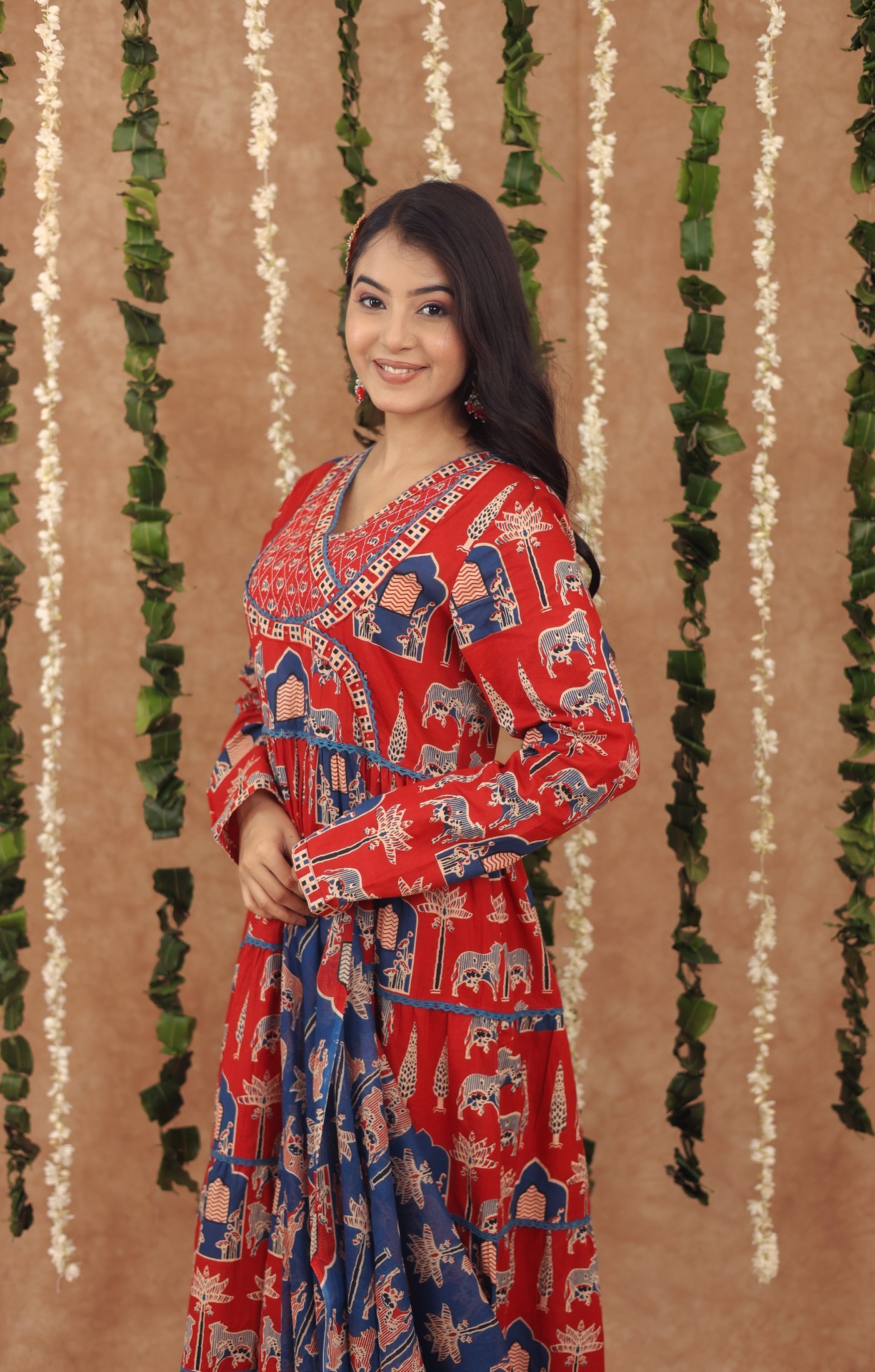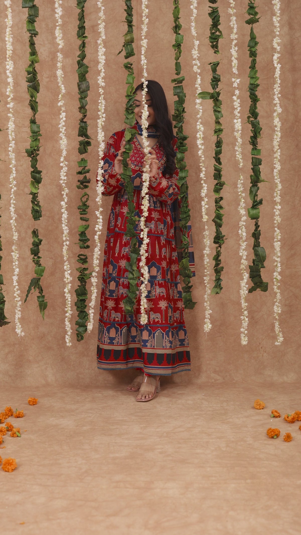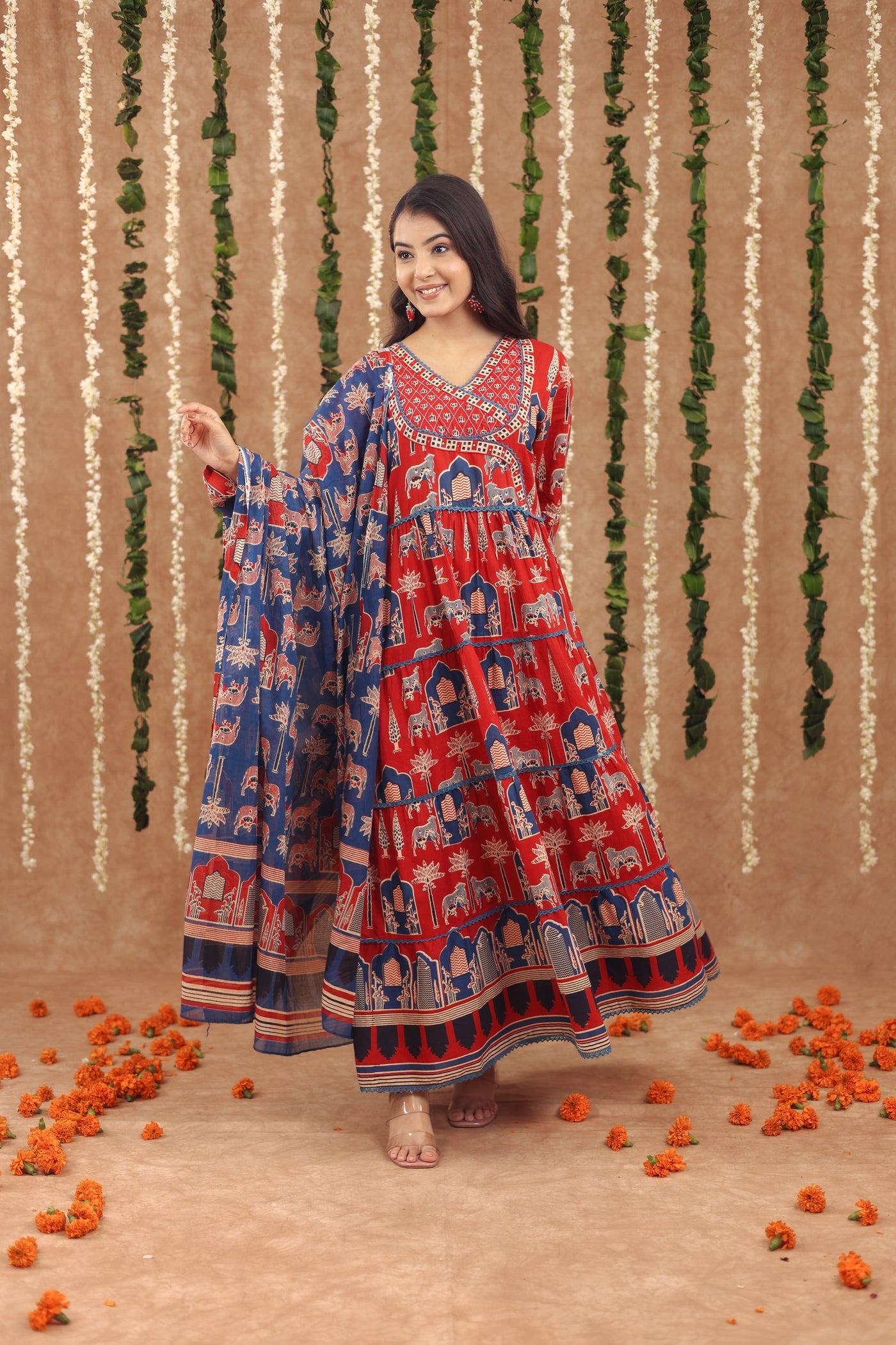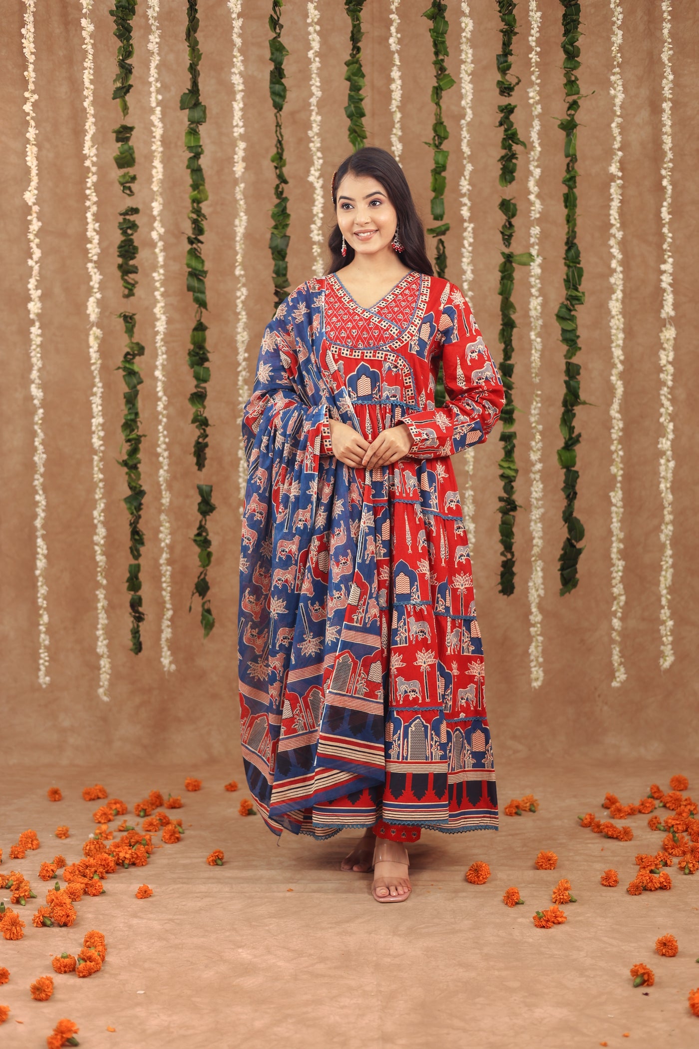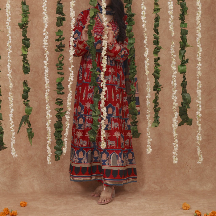 Women Angrakha Cotton Work Sequence Katha Embroidered and Crosia Lace Worked Animal Printed Kurta With Pant and Dupatta - Maroon / M