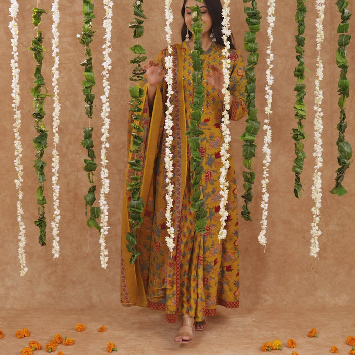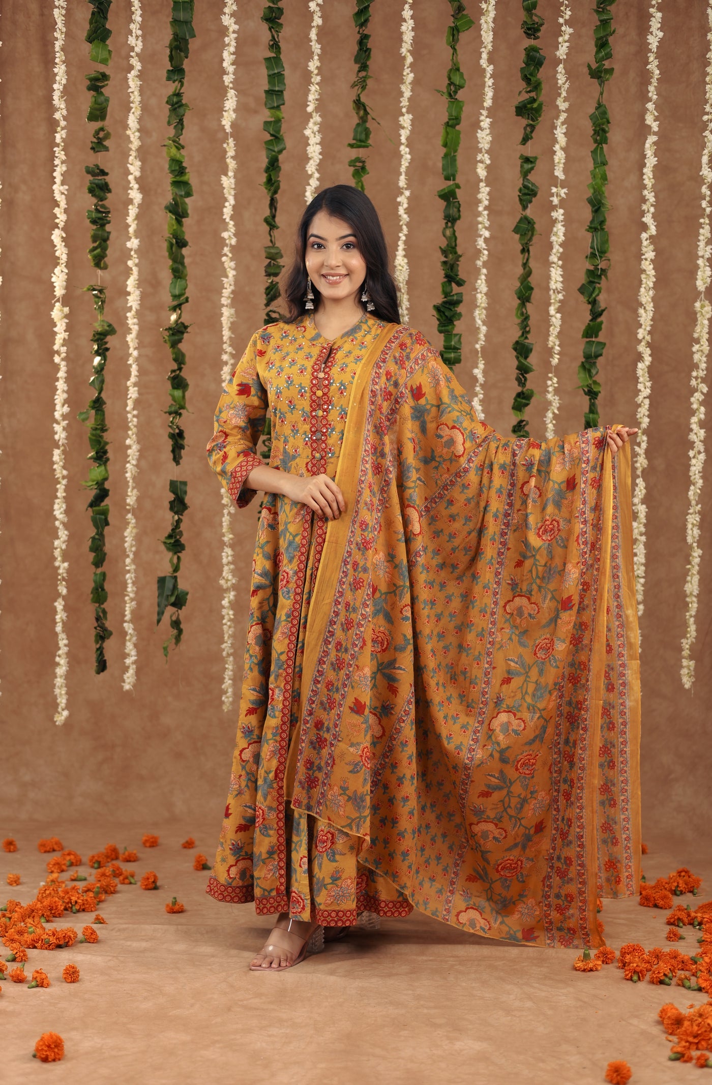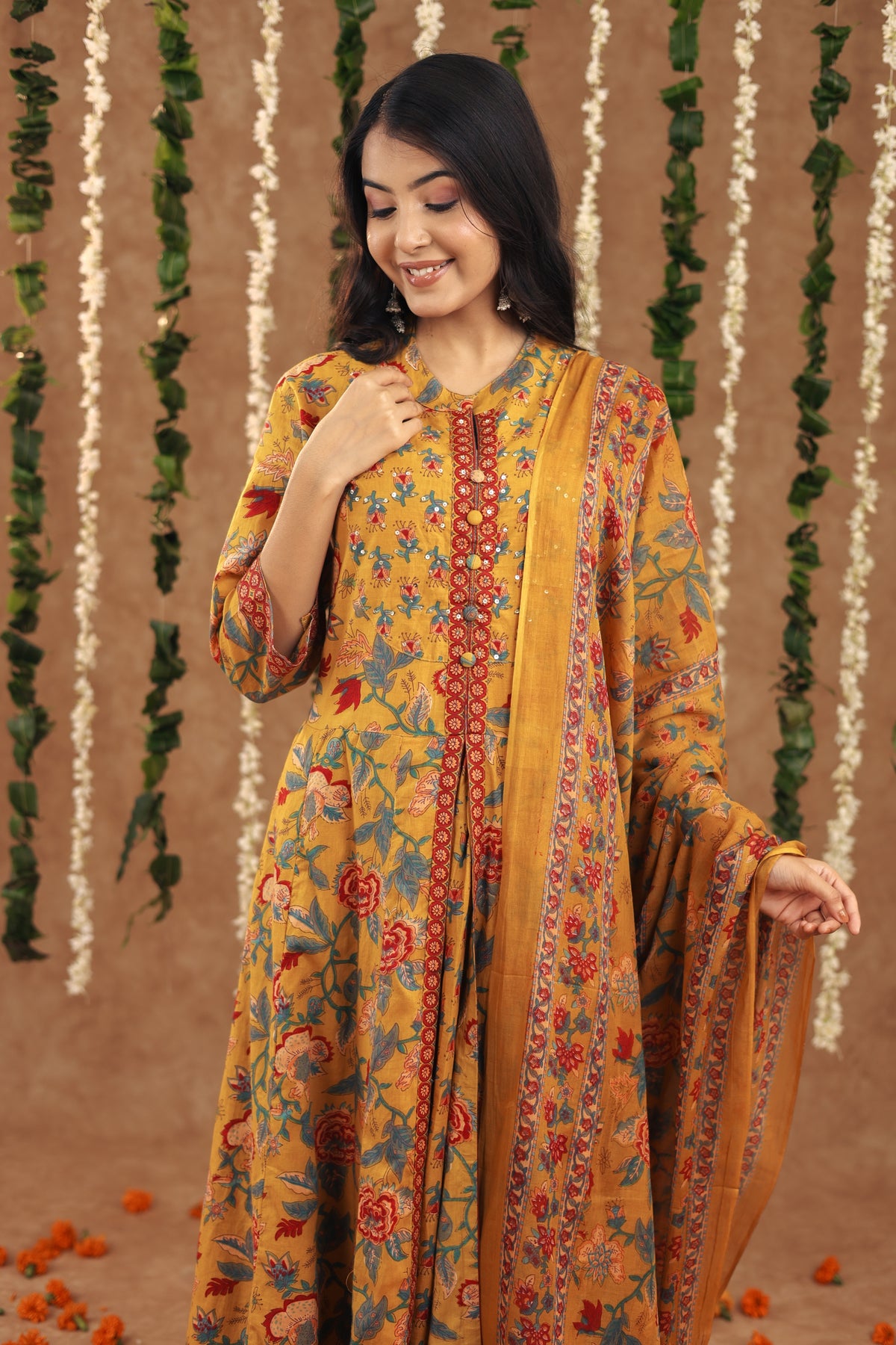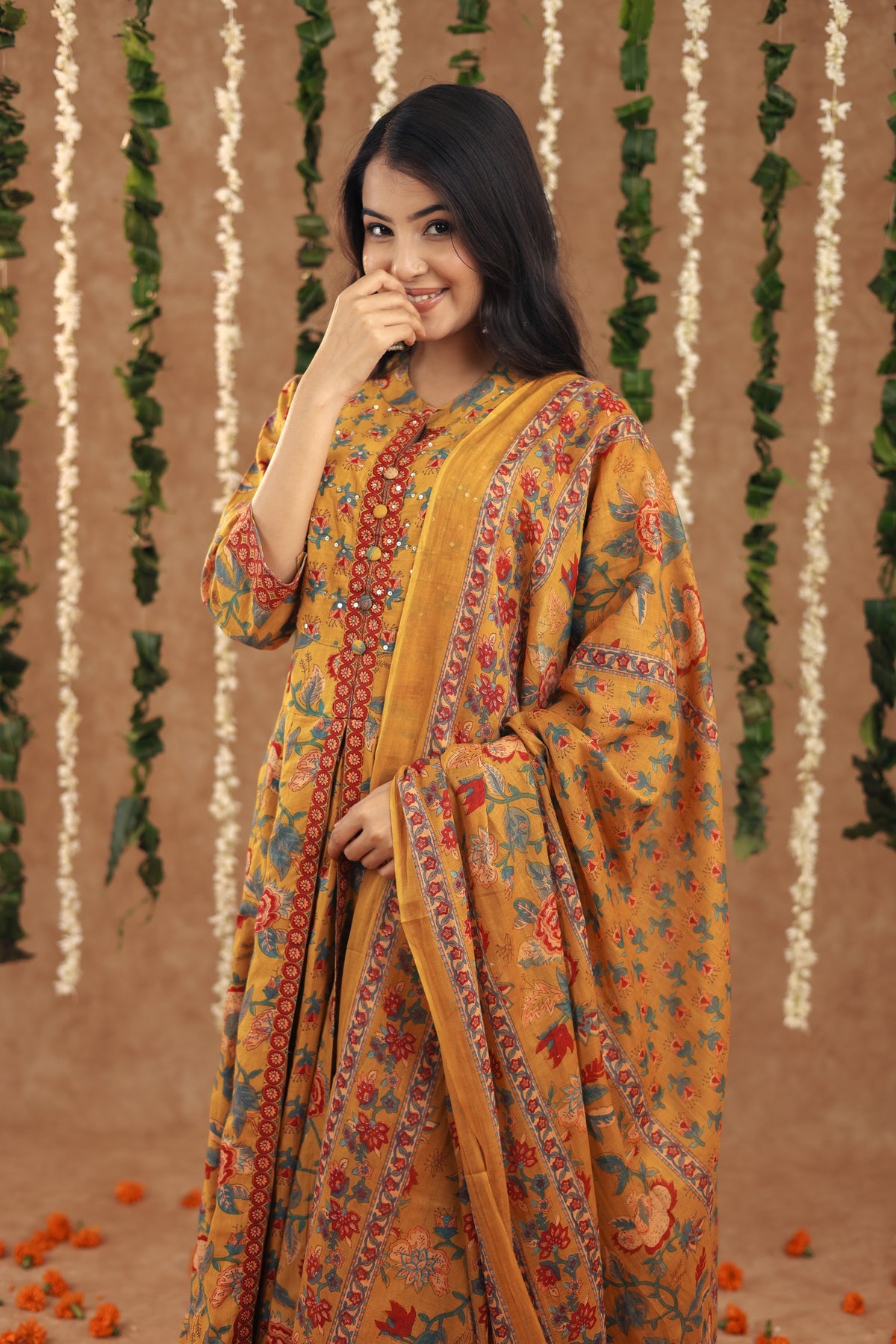 Women Festival Collection In Pure Cotton With Hand And Adda Mirror Work Mustard Yellow Flower Printed Kurti And Dupatta Set Fully Stitched Ready To Wear - Mustard Yellow / M