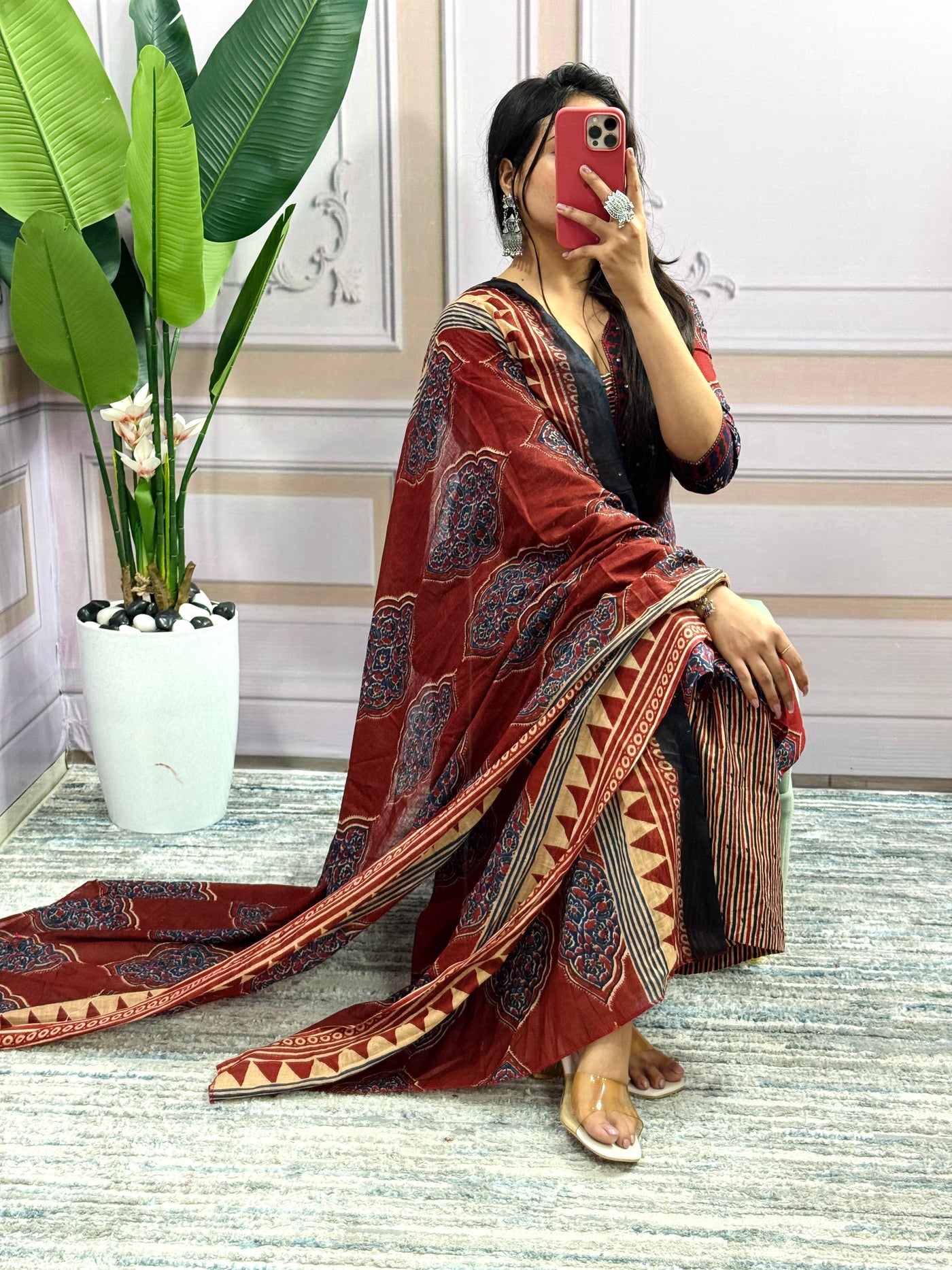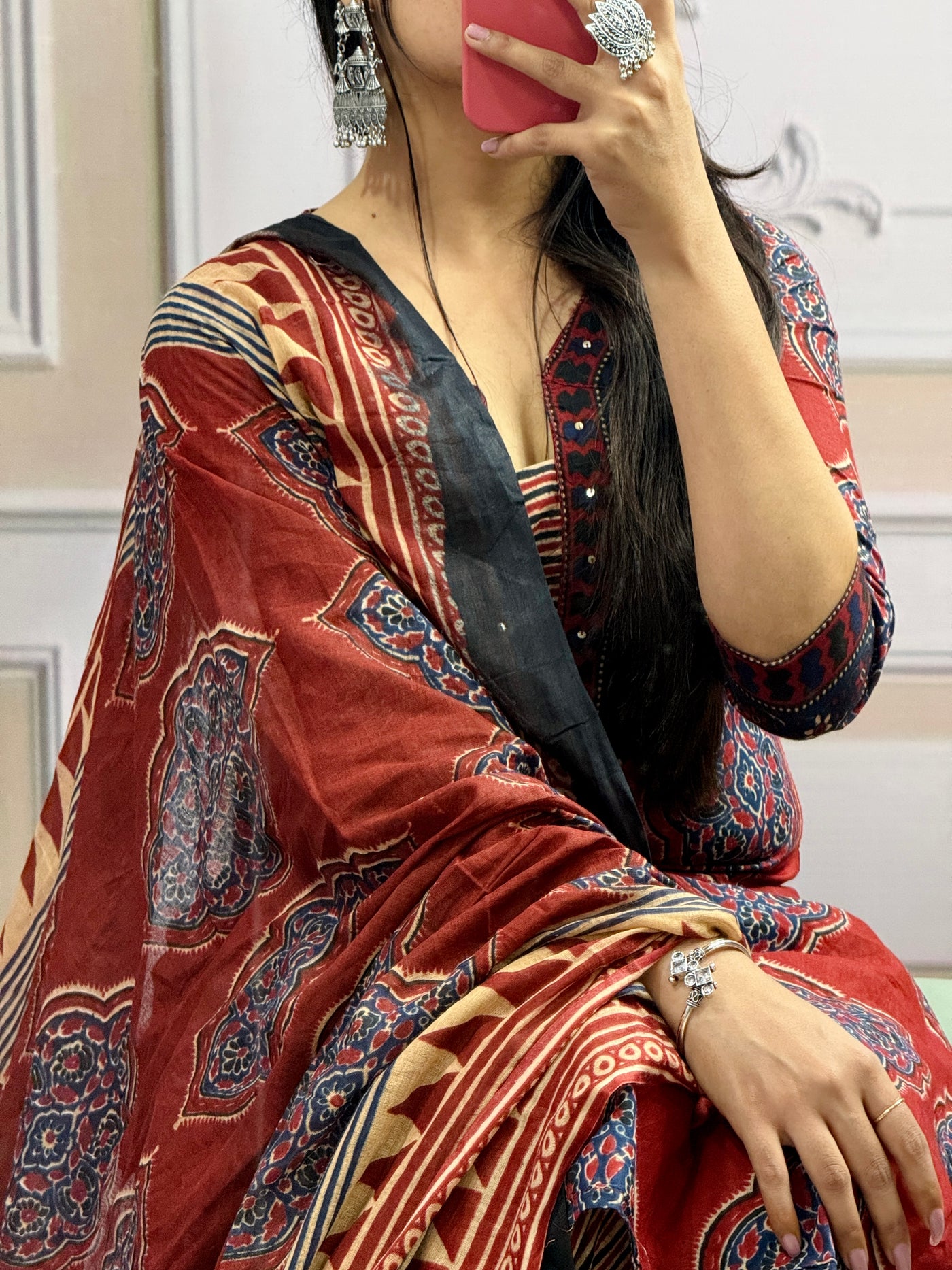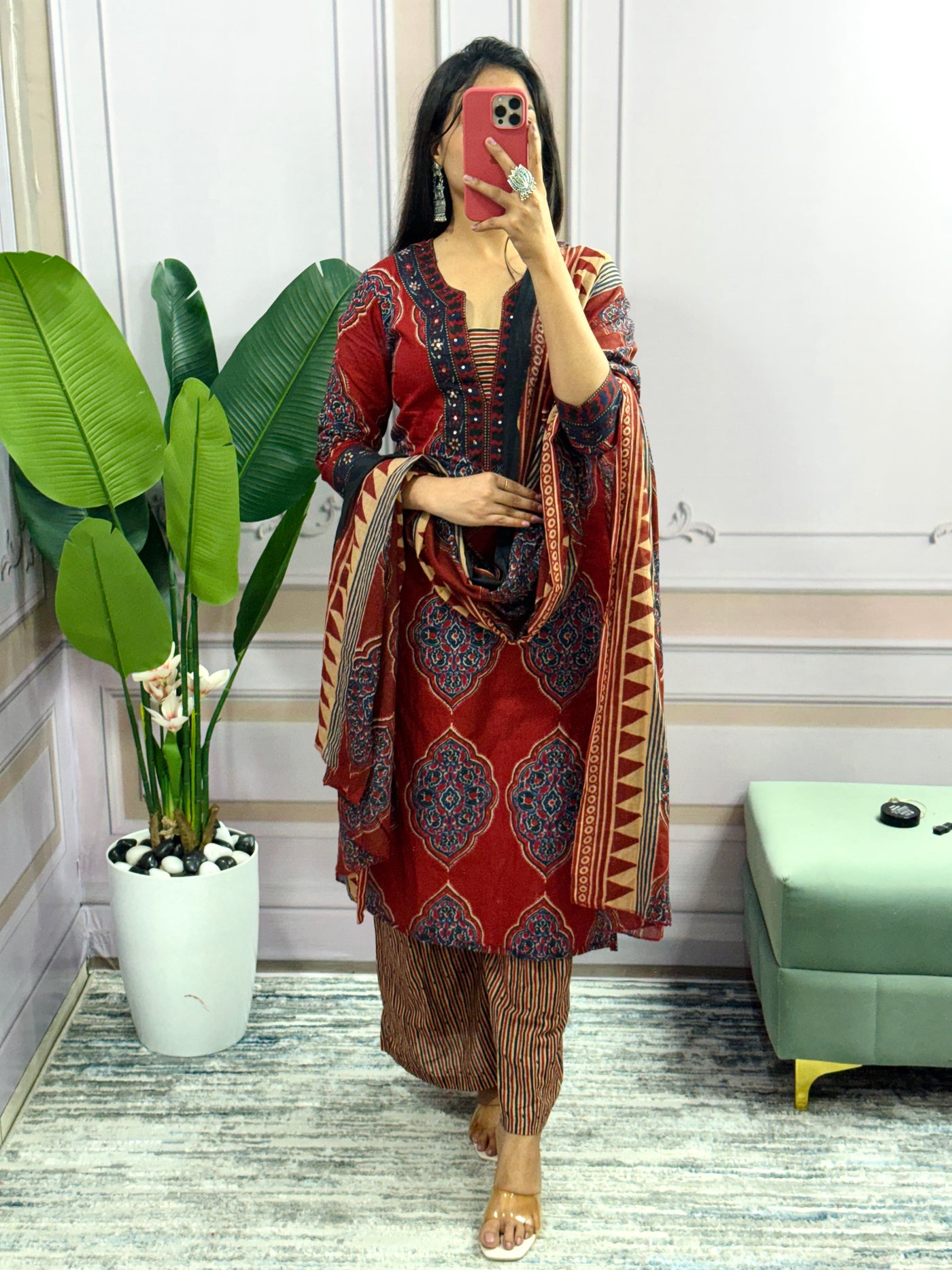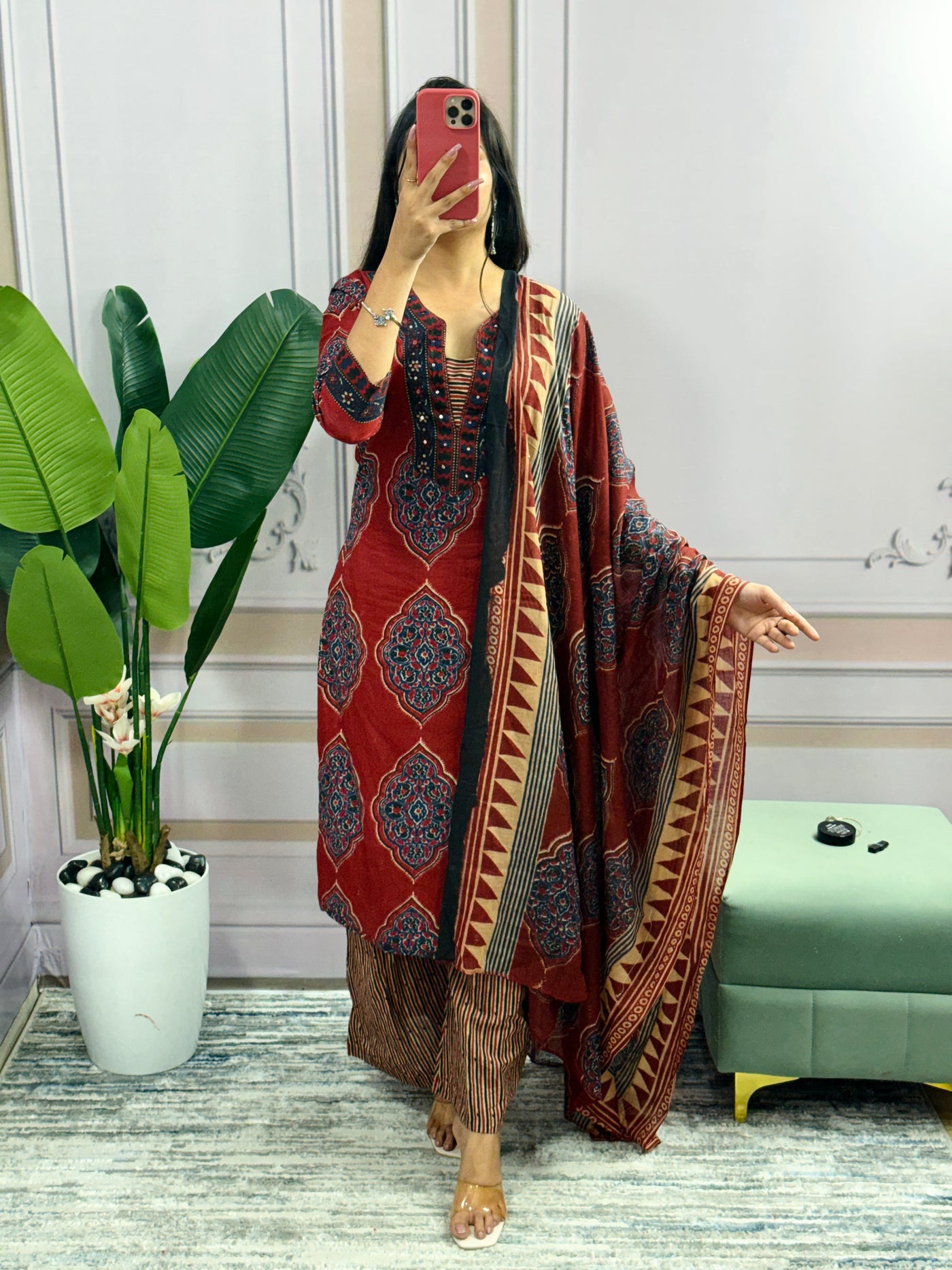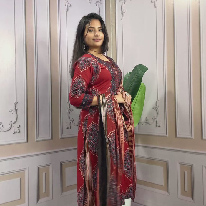 Women Beautiful Flower Printed Neckline Worked Maroon Kurta And Pant With Cotton Mulmul Dupatta - Maroon / M / Cotton